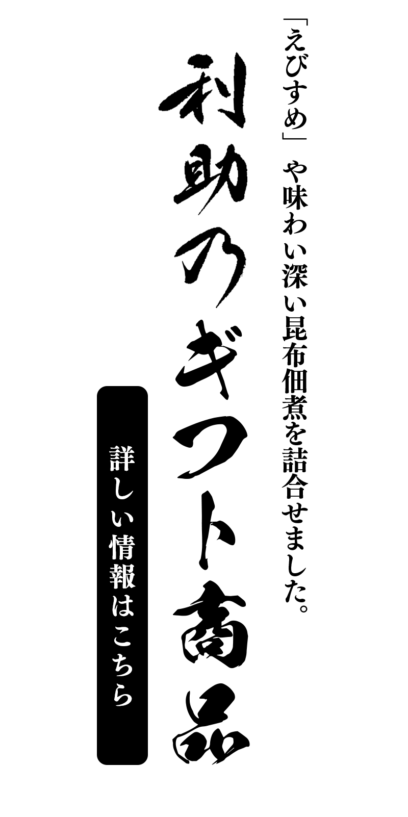 伝統の逸品である「えびすめ」を始め、利助乃が自信を持ってお勧めする塩ふき昆布詰め合わせ商品をご紹介。大切な方への贈り物や帰省のお土産にもご利用いただけます。北海道道南産の真昆布をじっくり丹念に二段仕込みで炊き上げました。歴代当主、山本利助の名に恥じぬ味の粋をご賞味ください。